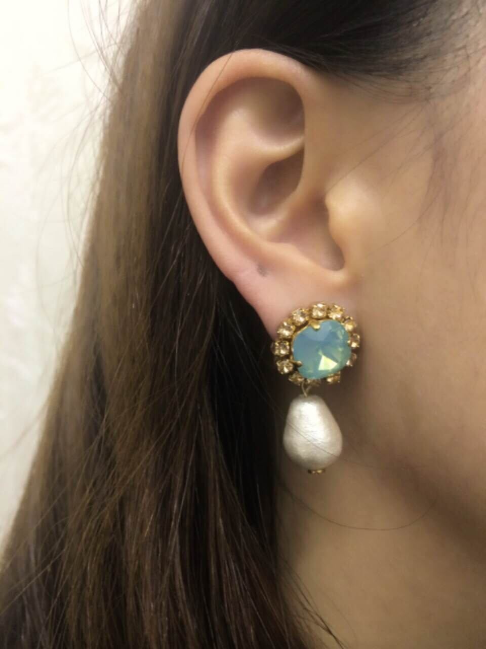 オパールカラーのスワロにベージュピンクのビジューラインストーンが付いたピアスにティアード型のコットンパールが揺れるピアスです。