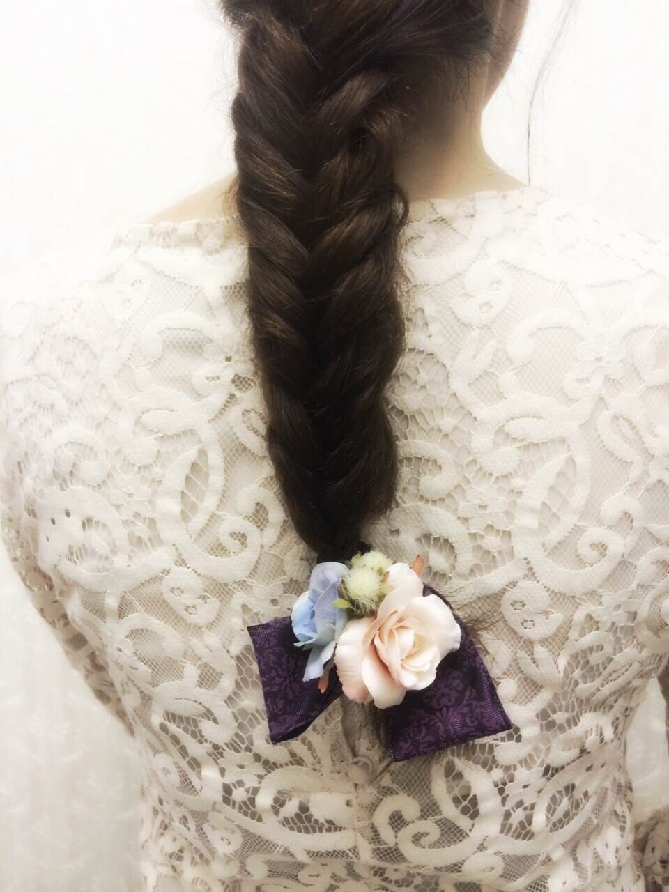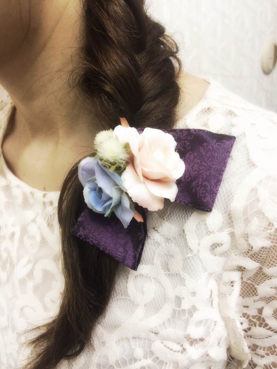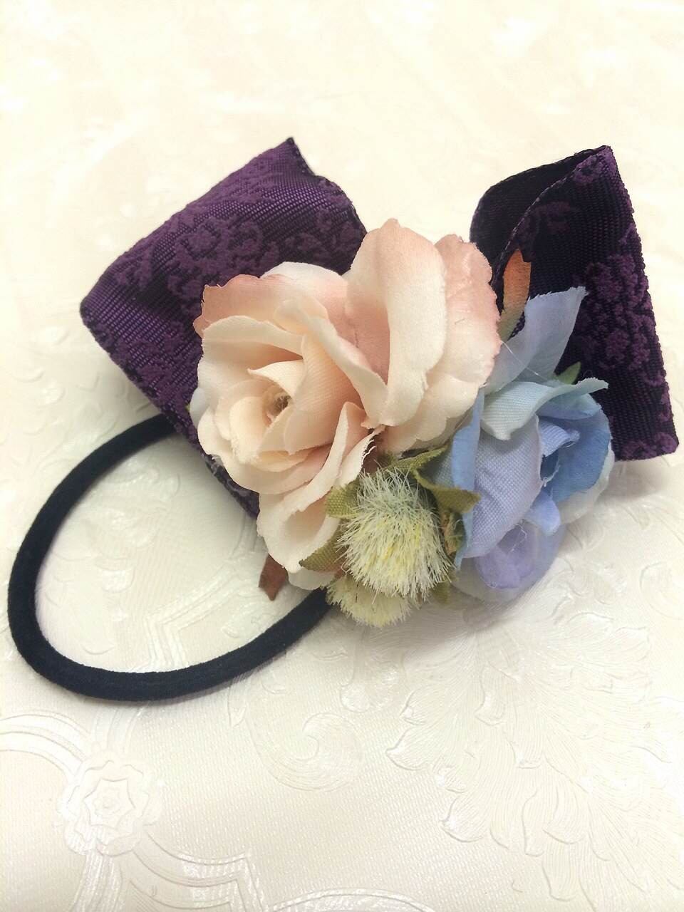 アンティークローズのペールピンクとブルーのアートフラワーにダマスク柄の深みのあるパープルのリボンのクラシカルなヘアゴムです。
