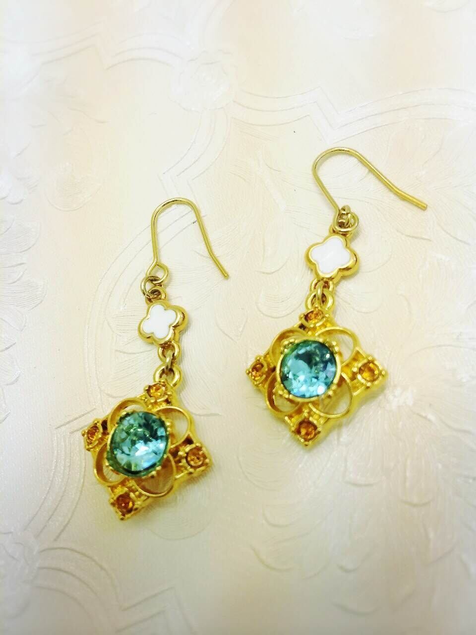 スワロビジューのアクアブルーとホワイトフラワーモチーフの飾りのフックピアスです。