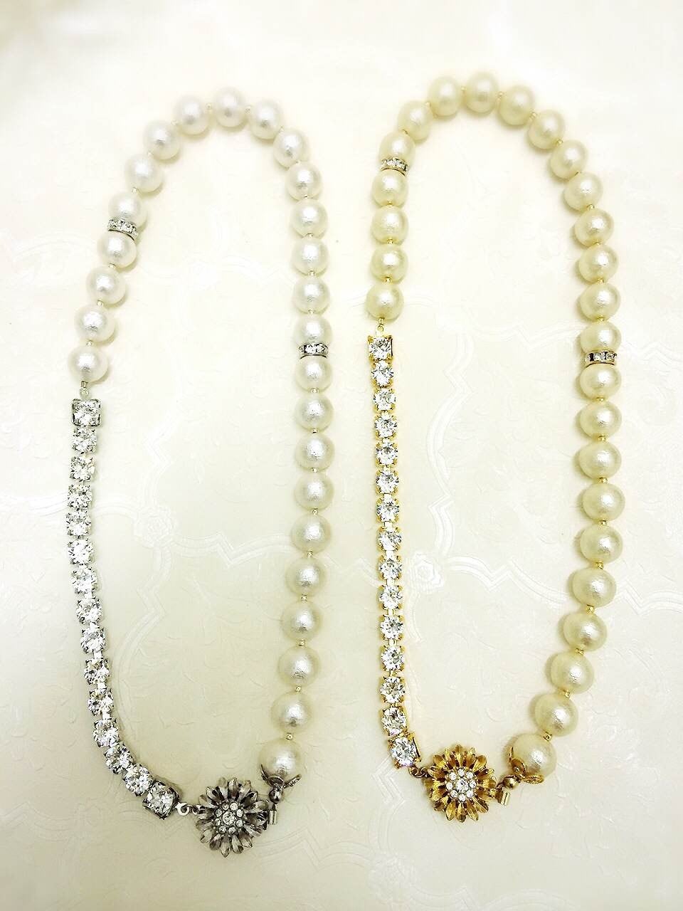 アンティーク風パーツの留め金でコットンパールとライストーンの豪華で上品なネックレス。