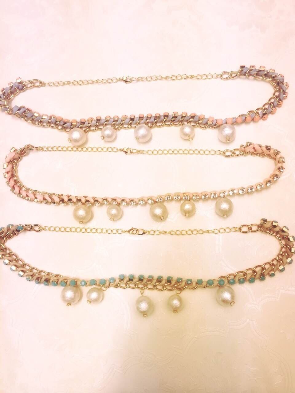ラインストーンをシルクリボンでチェーンネックレスに編み込んだ約40㎝のネックレスです。