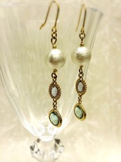 アンティーク調のパープルとモスグリーンのクリスタルと、コットンパールのフックピアスです。