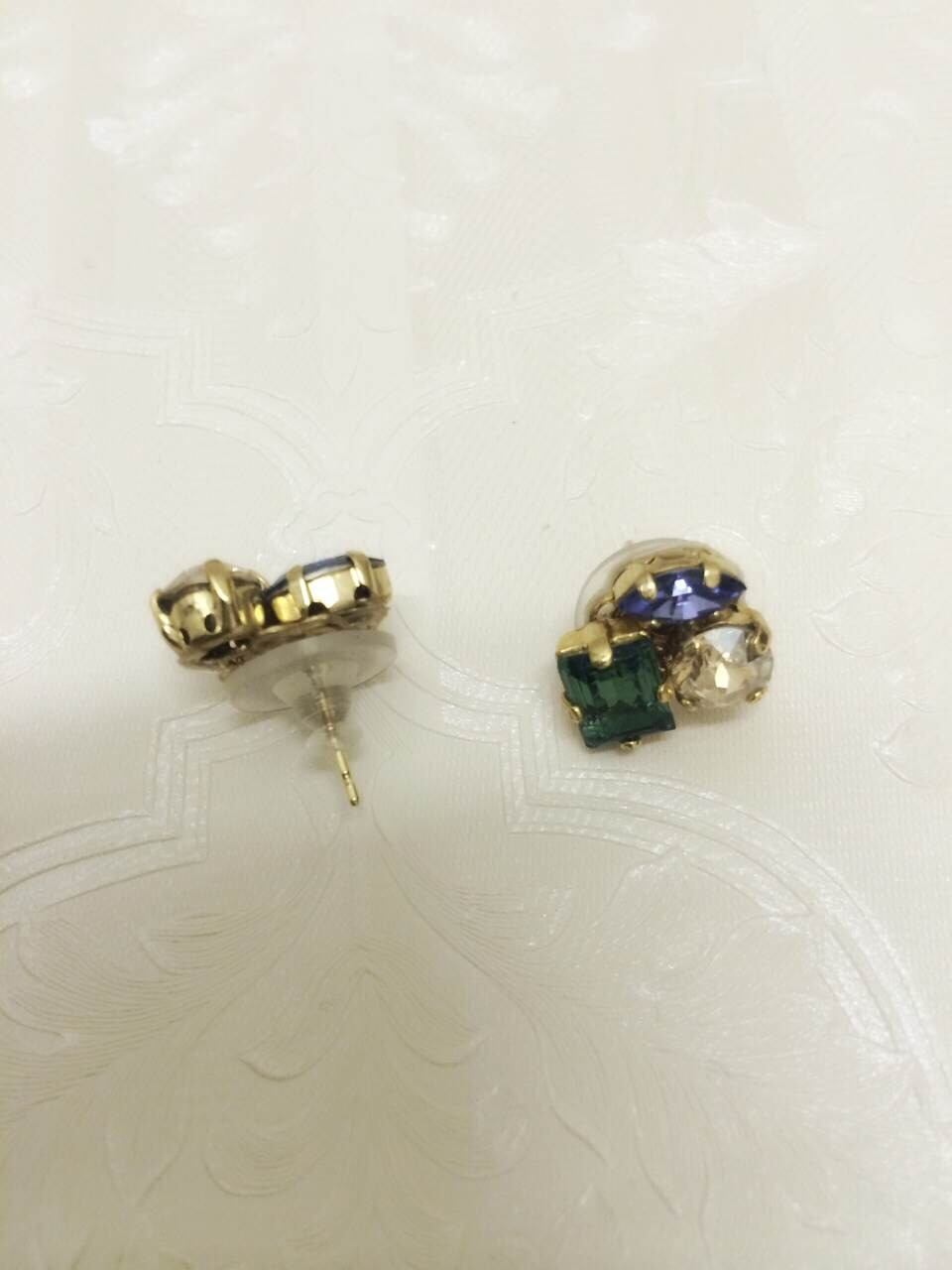 深いエメラルドグリーン、パープル、シャンパンゴールドのスワロビジューのピアスです。