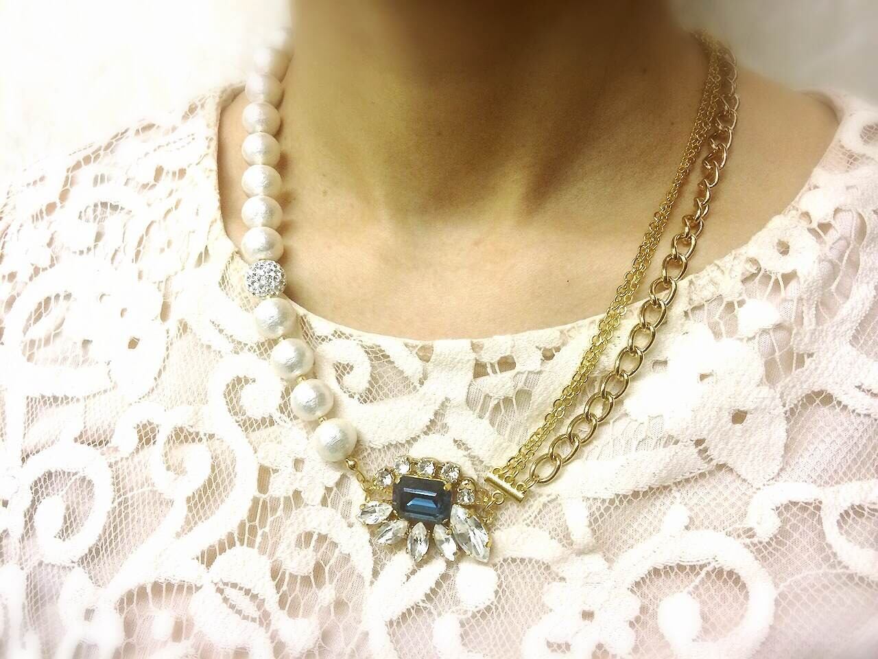 コットンパール×三連のチェーンネックレスにワンポイントのスワロビジューがついた豪華なネックレスです。