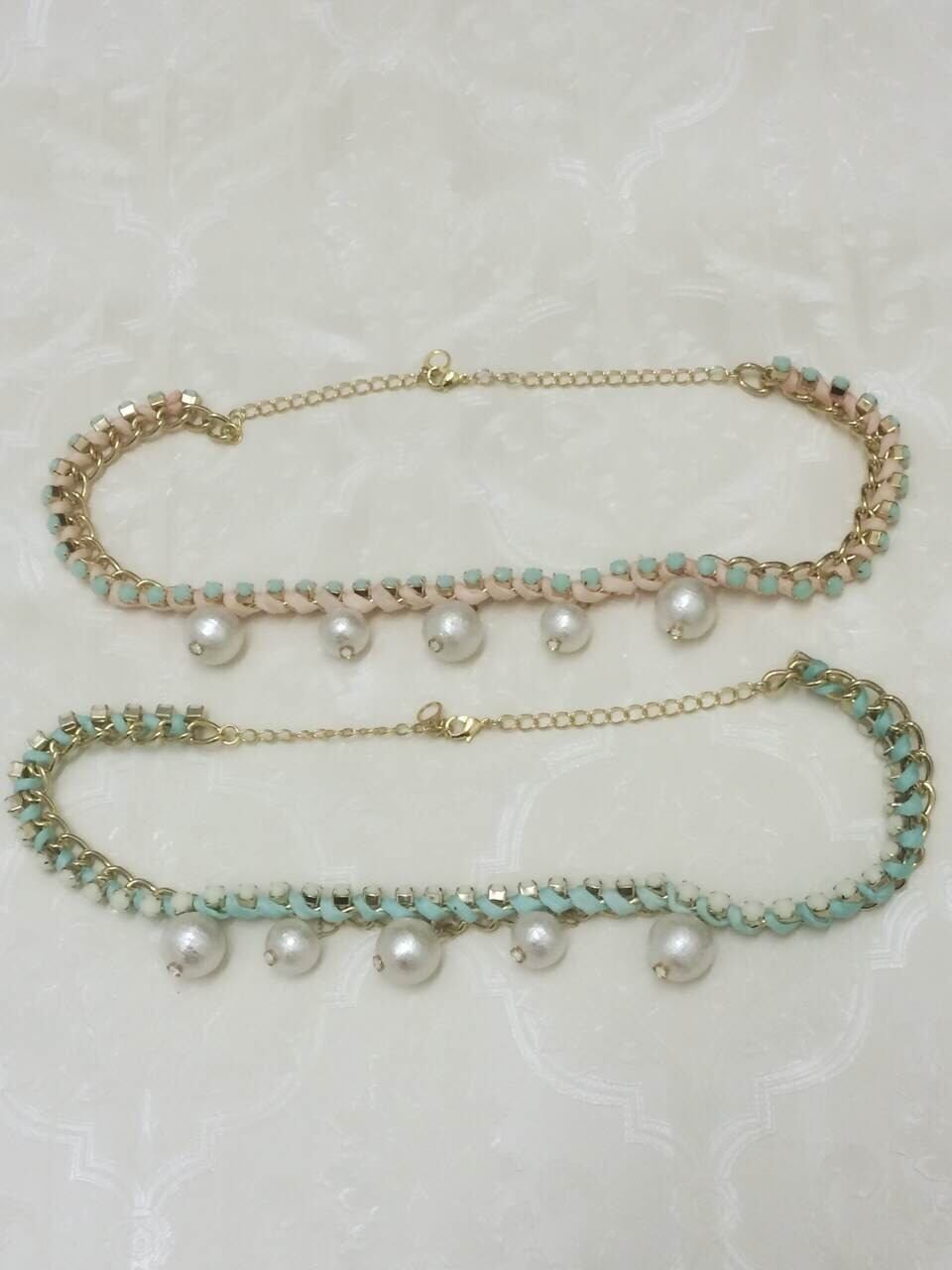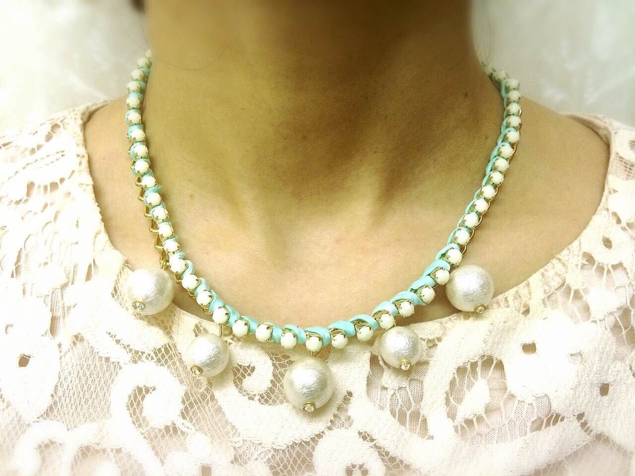 *ホワイトのラインストーン×ミントグリーンのシルクリボンのチェーンネックレス