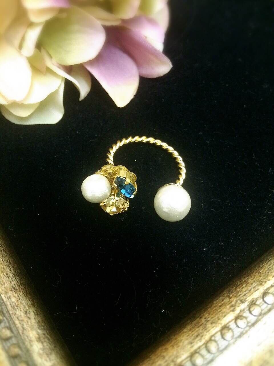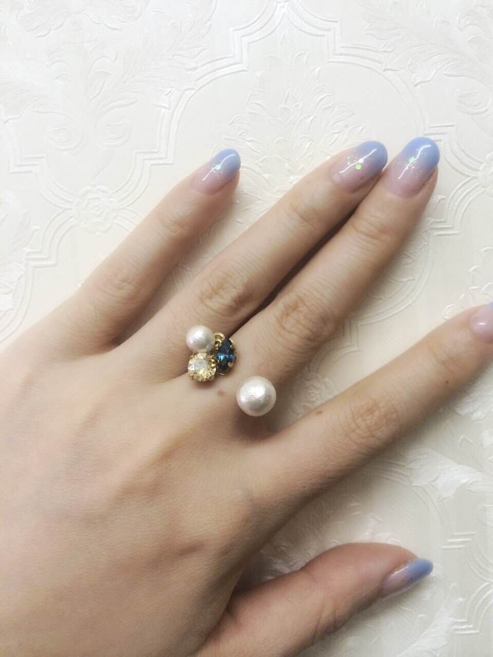 指にはめるとリング部分が隠れて、スワロビジューとコットンパールだけが見えるオシャレなデザインです。