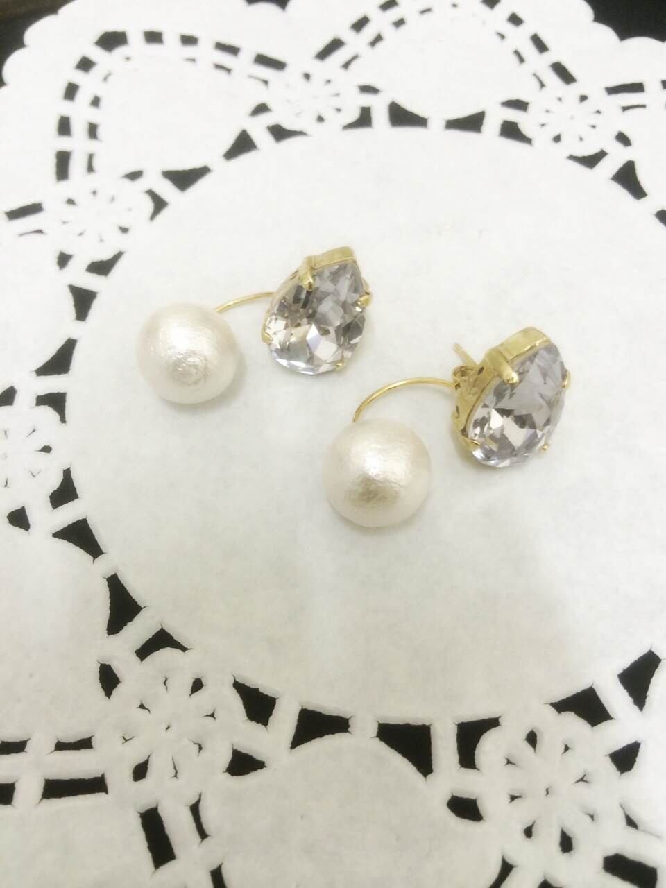 大粒の涙型スワロビジューが印象的でキャッチにコットンパールが付いたピアスです。