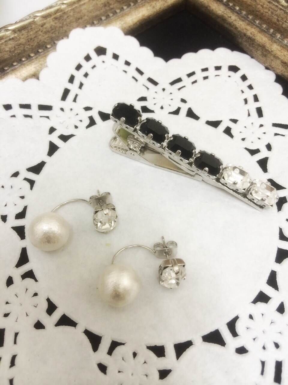 クリスタルのビジューとコットンパールの組み合わせで服を選びません。