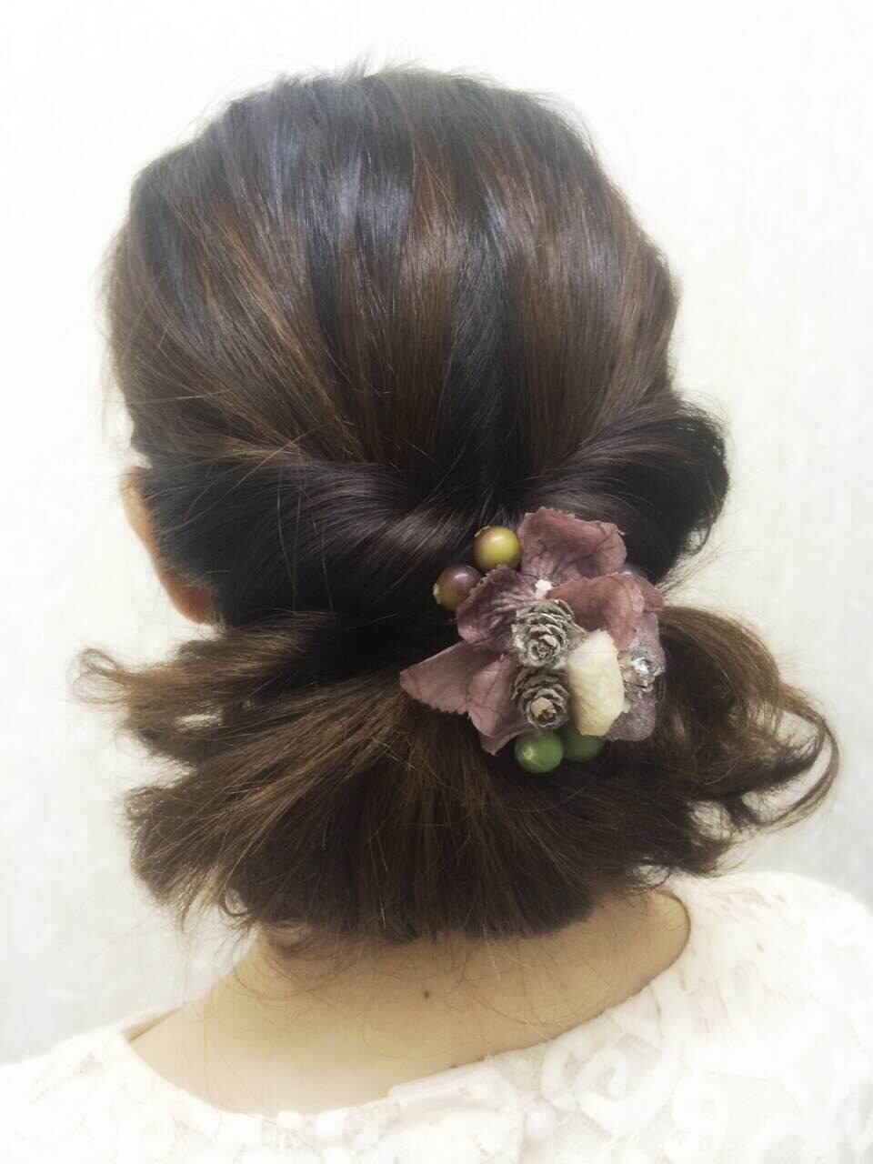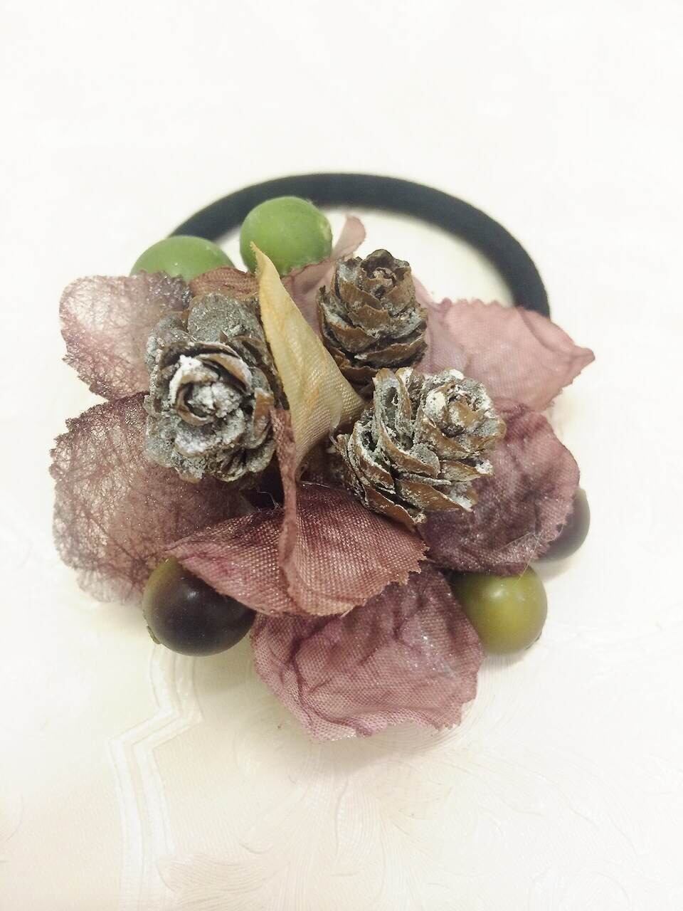 アンティークな風合いでまとめられた木の実や松ぼっくりが付いたナチュラルシックなヘアゴムです。