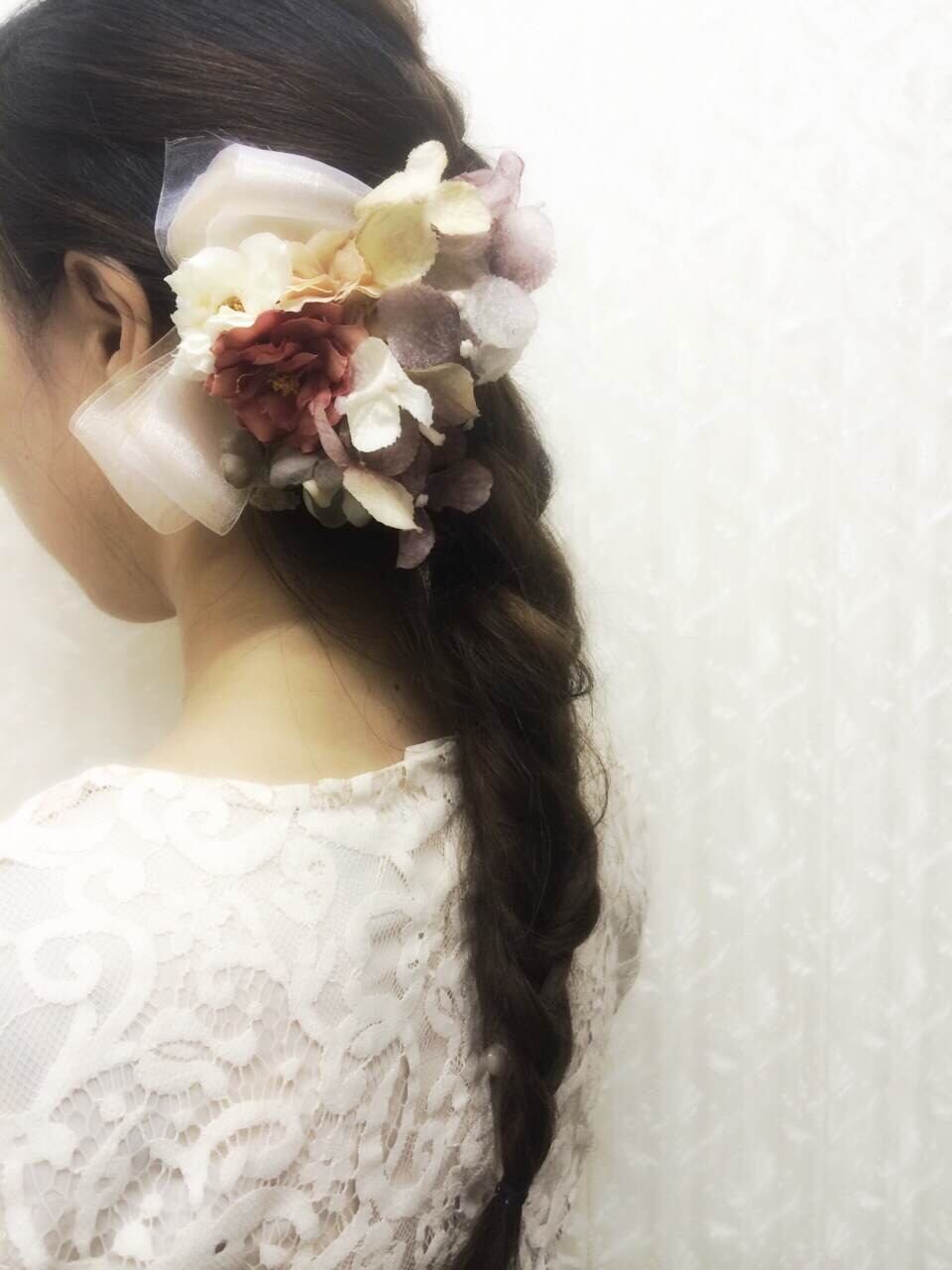 あじさい、オフホワイトとクラシカルピンク、サーモンピンクの野ばらなどたくさんのアートフラワーをあしらったヘッドドレスです。